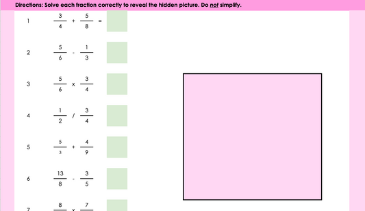 Four Operations Fractions (No Simplifying) Picture Reveal