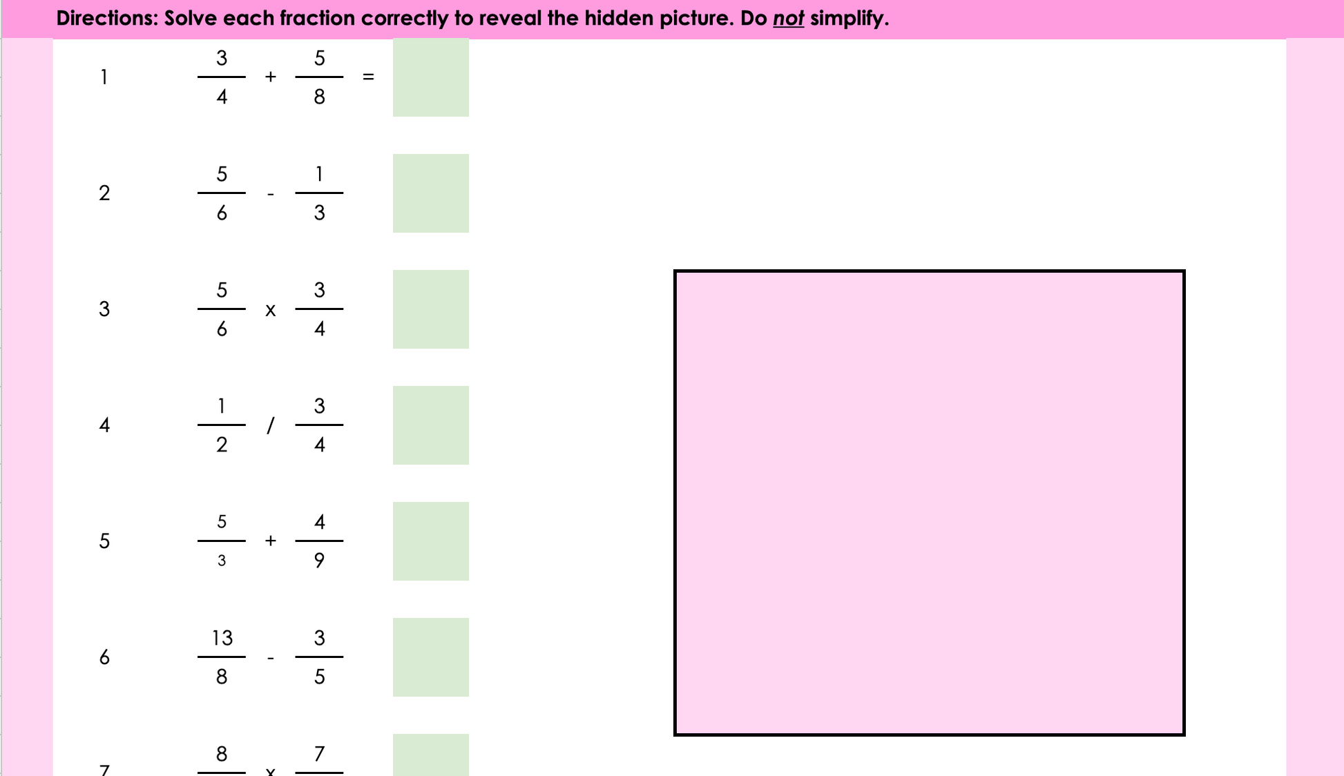 Four Operations Fractions (No Simplifying) Picture Reveal